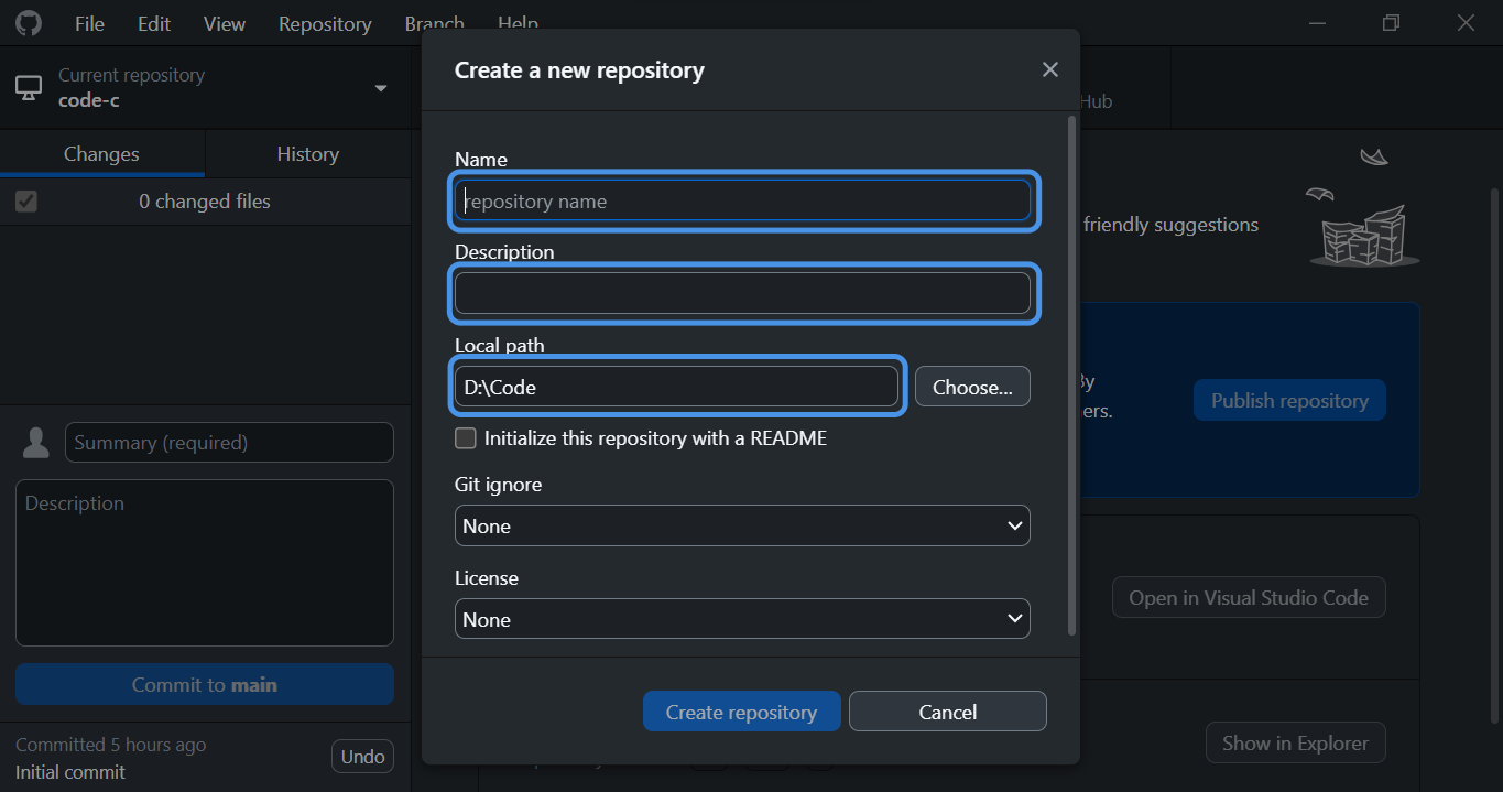 - Ensuite, remplit les différents champs (le nom du repository, une description du projet, l'emplacement local du projet, etc...)