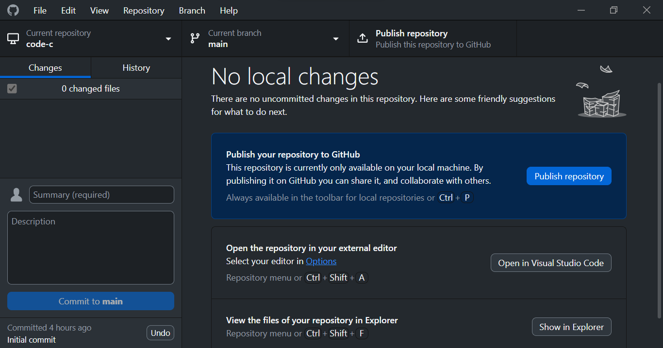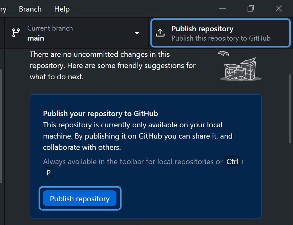 Après avoir créé un repository, il faut maintenant le rendre disponible sur Github en cliquant sur Publish repository ou en utilisant le raccourci clavier Ctrl + P. Ainsi tu pourras avoir accès à ton projet sur Github, le partager, collaborer avec d'autres personnes et y apporter des modifications.