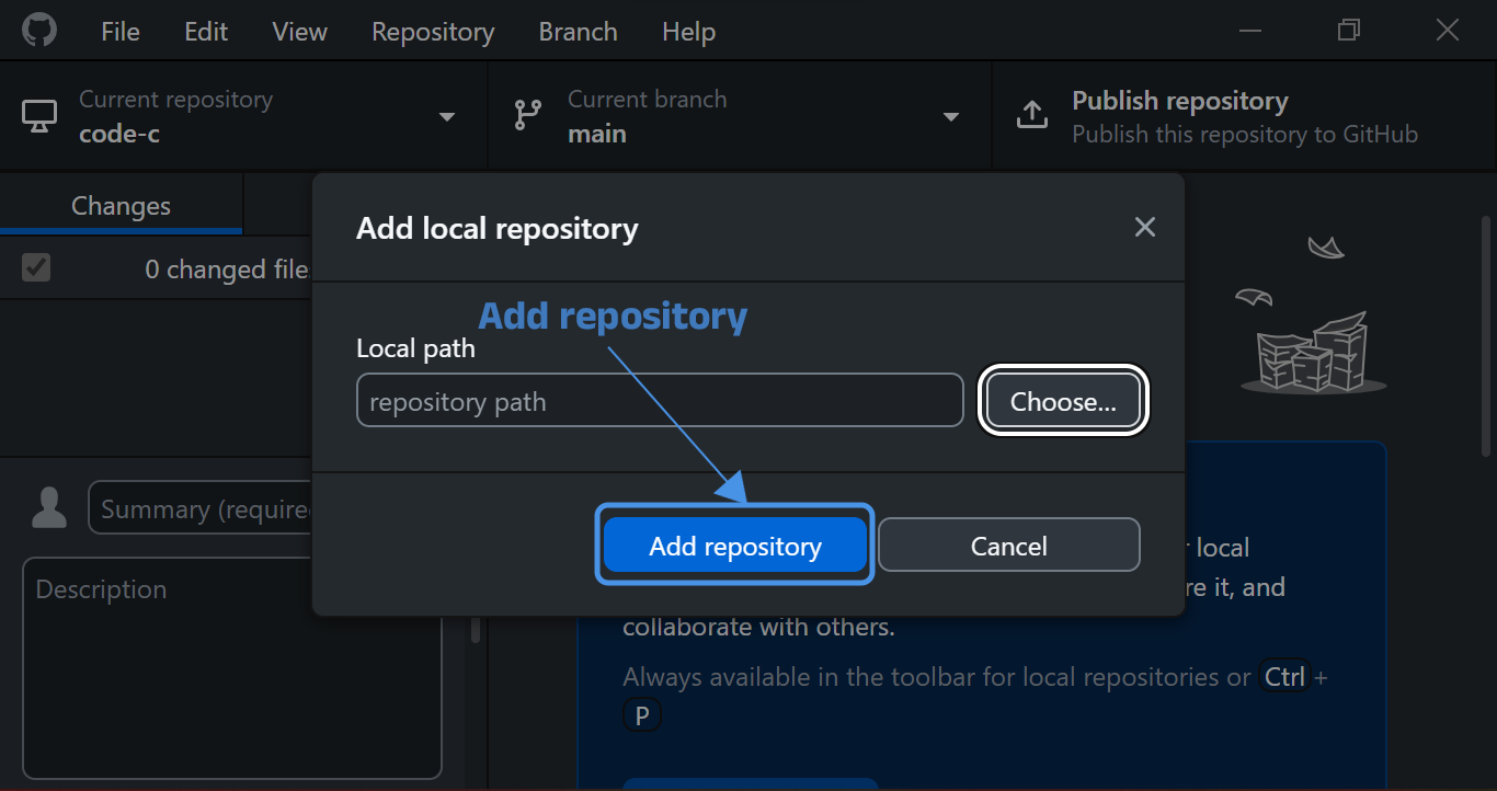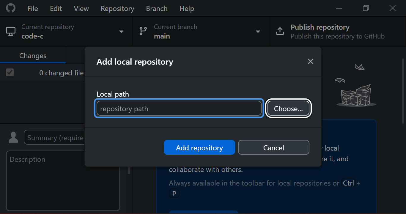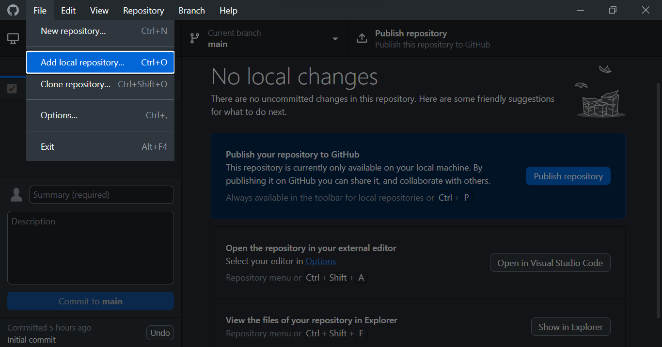 - Dans Github Desktop, clique sur File > Add local repository (ou tout simplement sur le raccourci clavier Ctrl + O).
