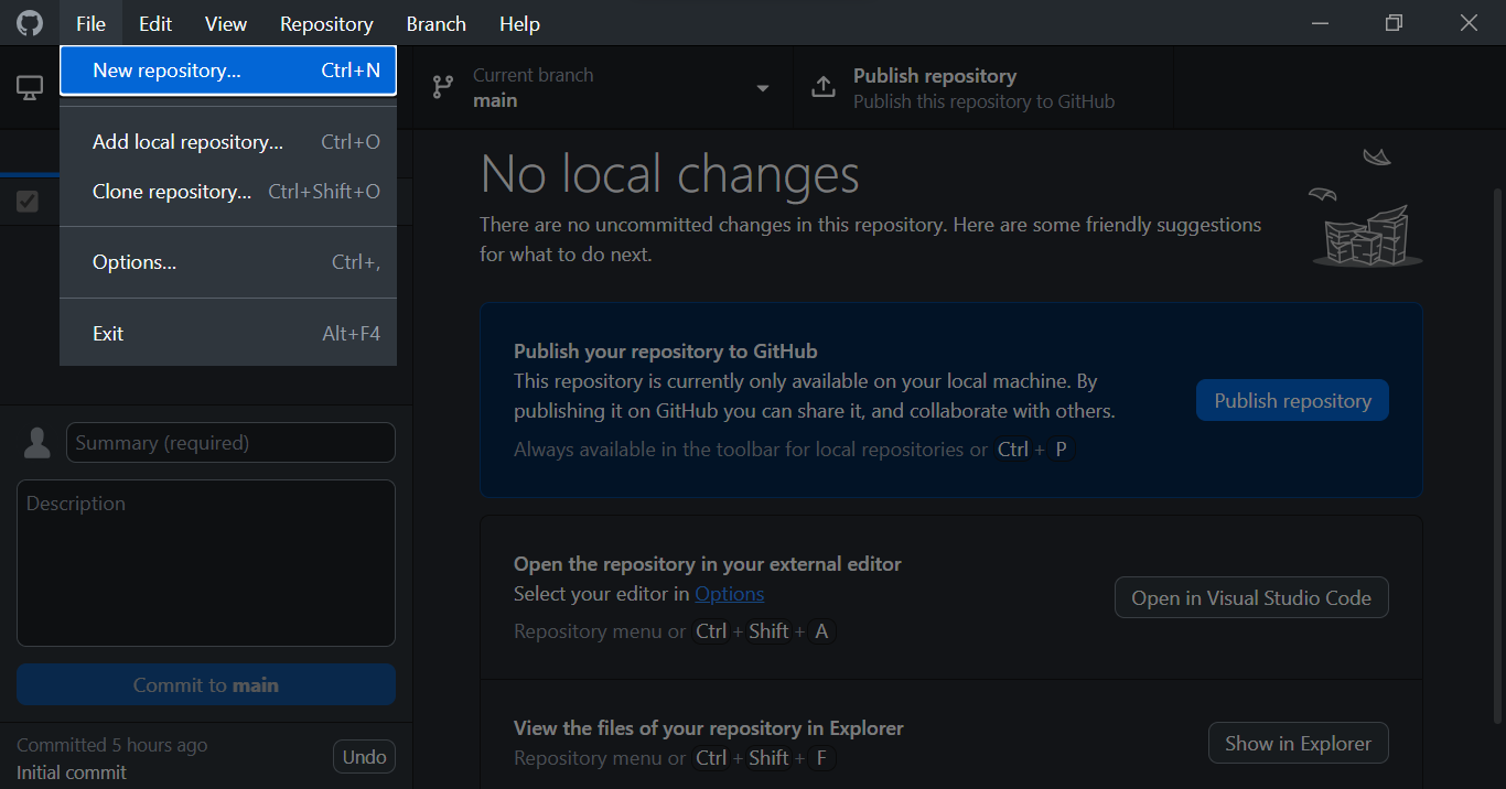 - Dans Github Desktop, clique sur File > New repository (ou tout simplement sur le raccourci clavier Ctrl + N).