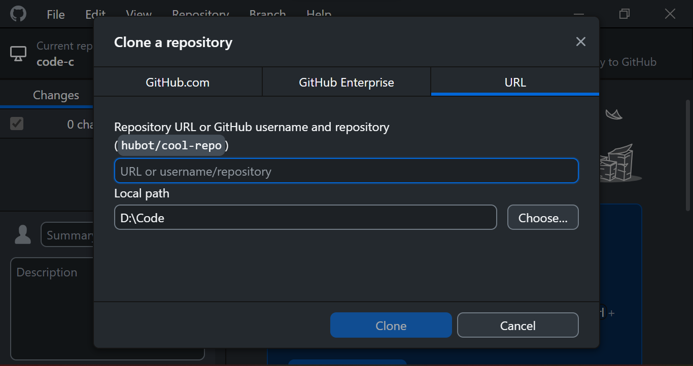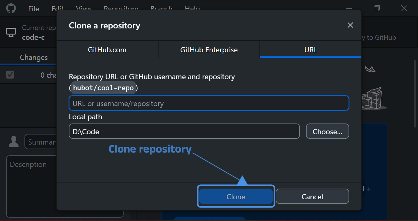 - Ensuite met l'URL du repository et choisir l'emplacement local qui contiendra ton dépôt.